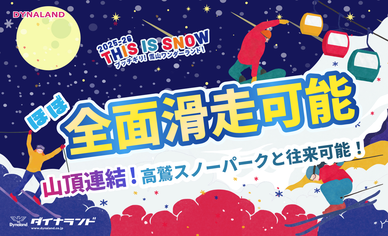 【◎:全面滑走可能】高鷲スノーパークとの往来可能に!タカスダイナの本領発揮へ!!ダイナ17コース開放! 6時~夜23時まで超ロング営業!!パークはエリア最大数の7アイテム!!