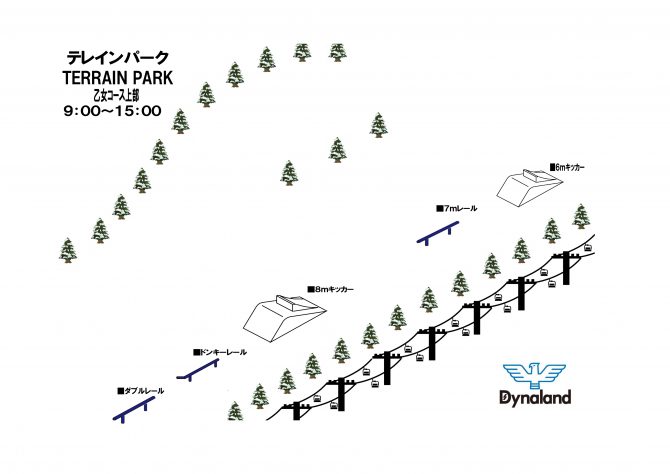 | Re:テレインパーク | ◯ | 【場所】 乙女コース 上部~中腹 【開放時間】 9:00 ~ 15:00 【開放アイテム】 全5アイテムHIT! ・6m / 8mキッカー ・7mレール ・ダブルレール ・ドンキーレール |