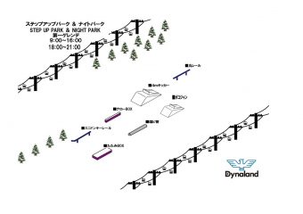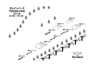 | Re:テレインパーク | ◯ | 【場所】 乙女コース 上部~中腹 【開放時間】 9:00 ~ 15:00 【開放アイテム】 全9アイテムHIT! ・3m / 4m / 6m / 8mキッカー ・ワイドBOX ・ナローBOX ・7mレール ・ダブルダウンレール ・ドンキーレール |
