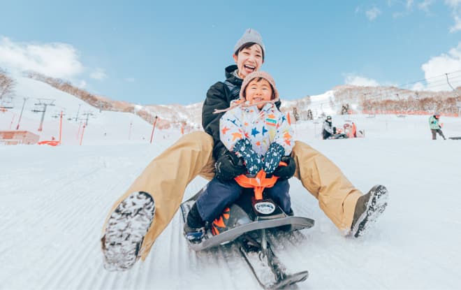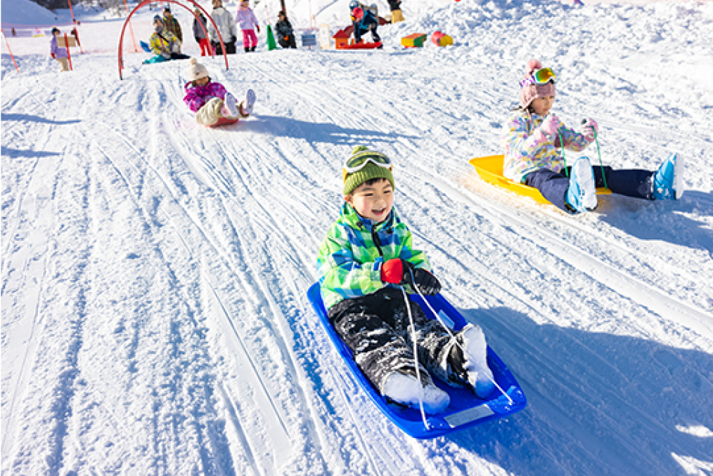ムービングベルト完備のキッズパークに、屋内遊具エリア。ソリもチュービングも、子供たちが飽きずに遊べる「雪の遊園地」。