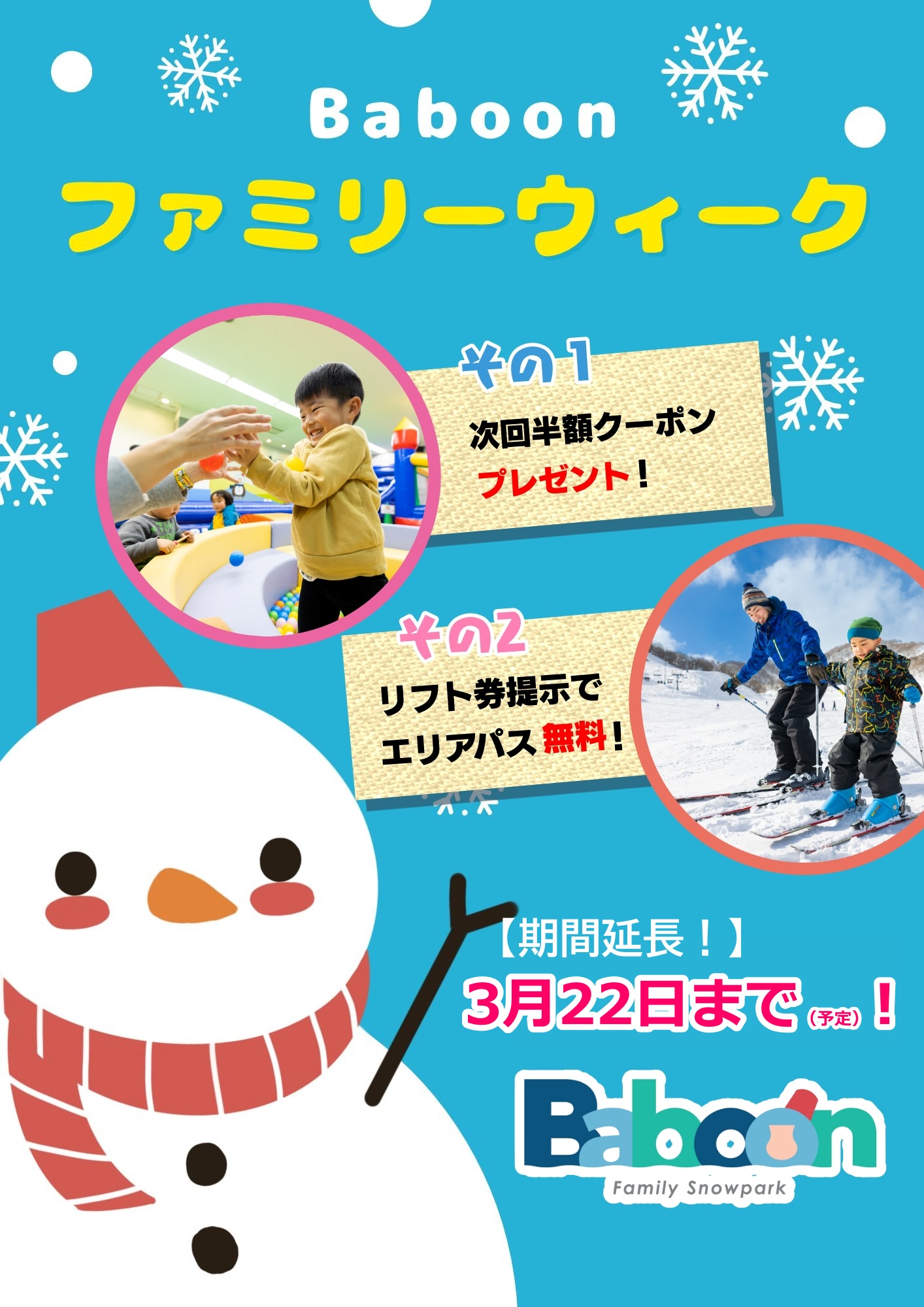 イベント期間中に、Baboon エリアパス(1,000円)を定価でご購入いただいた方に、次回ご家族で使える エリアパス半額券をプレゼント!